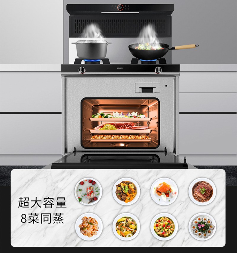 擁有一臺北斗星A5,等于擁有了油煙機、燃氣灶、消毒柜/大蒸箱,就能兼顧到各種功能的使用需求,而且還可以節約成本和空間。北斗星A5大容量蒸箱:不串味。上面炒菜、下面蒸菜,一鍵烹飪,小白變大廚,30分鐘就能夠輕松搞定一桌菜,不再為漫長的烹飪過程而辛苦勞累!