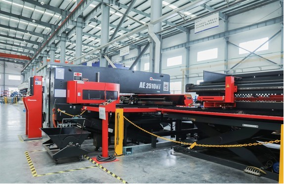車間的數控沖剪系統生產區域,能夠根據已編好的程序,使機床自動加工零件,實現了鋼板的合理化切割利用,在提升生產效率的同時,也大幅降低了原材料的浪費。